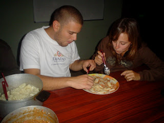 Podemos dizer que tivemos um jantar romântico à luz do computador…(ehehe) entretanto, como so tinhamos comprado 3 pratos, tivemos que dividir-nos em grupos de dois, para cada grupo partilhar um prato, o que tornou o nosso jantar ainda mais caricato. È de notar que aproveitávamos o flash das máquinas fotográficas para fazer o ponto da situação, ao longo do jantar…