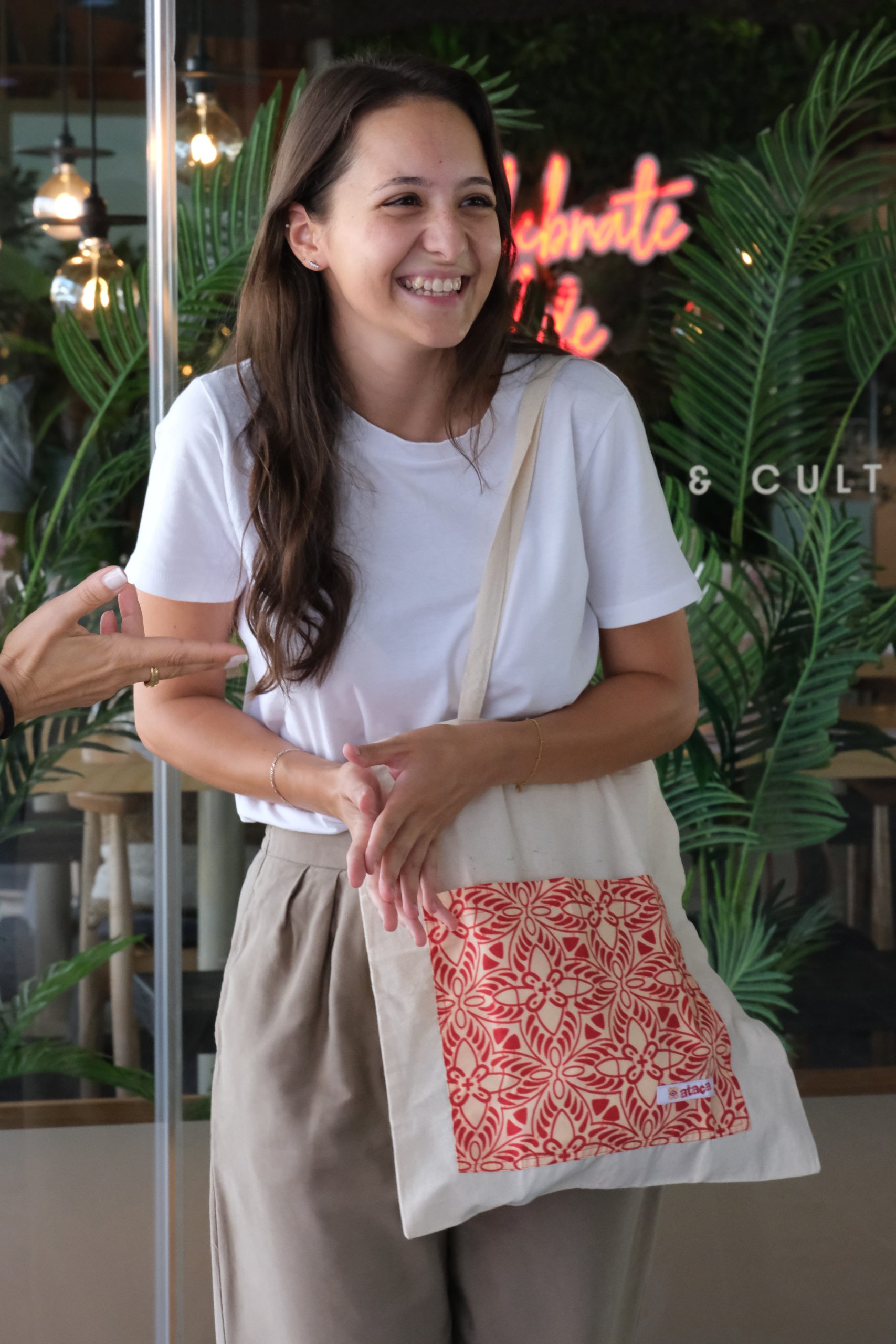 Tote Bags com bolso em capulana e a frase “Juntos Podemos Mudar o Mundo”