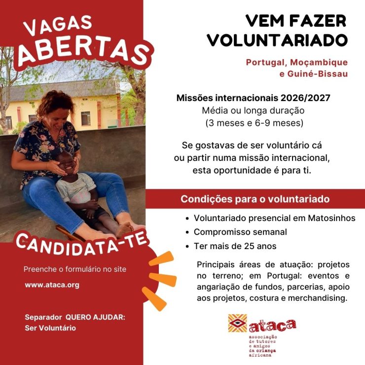 Se gostavas de fazer voluntariado em 2026-2027, junta-te à ATACA, em Portugal ou no terreno! Todos os voluntários são bem-vindos, mas se és entusiasta da costura ou gostavas de vir a integrar no futuro uma missão de voluntariado em África, esta notícia é mesmo para ti. A ATACA tem a sua atuação dividida entre Portugal, Moçambique […]