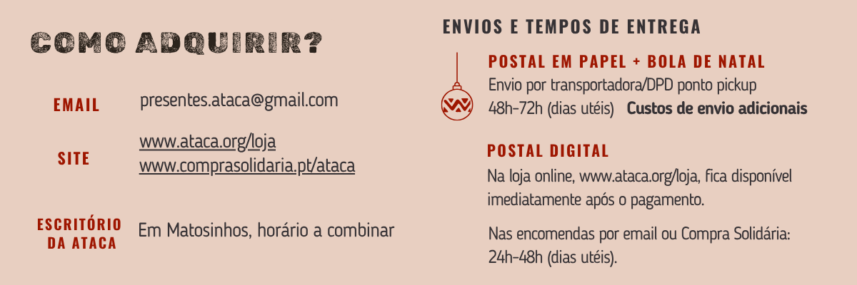 A campanha dos presentes solidários da ATACA decorre pelo sexto ano consecutivo como estratégia para dar resposta a necessidades identificadas no terreno junto das comunidades mais desprotegidas e que tem tido um impacto muito positivo na vida das pessoas apoiadas.