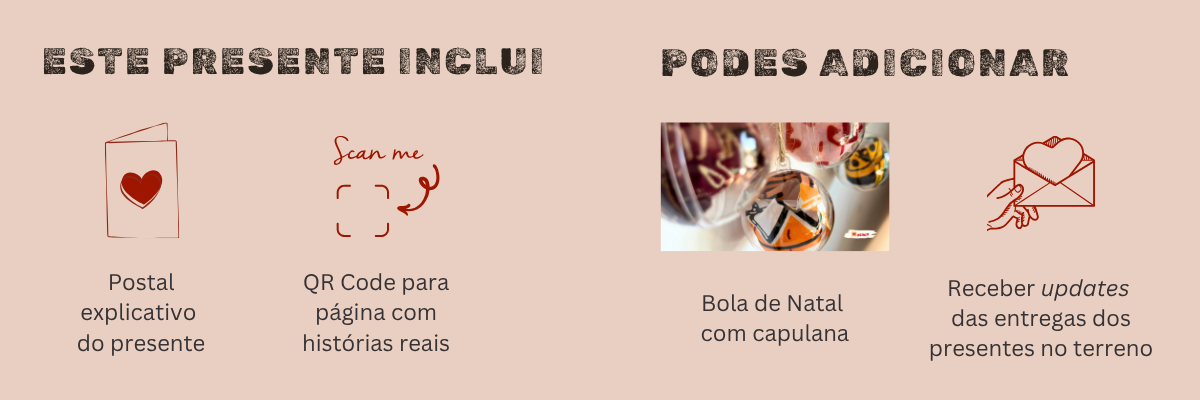 “Aqui no terreno sentimos uma ligação com cada pessoa que escolheu comprar um presente solidário, apesar de não a conhecermos. Porque o momento que vivemos quando estamos a comunicar a alguém aqui que vai beneficiar de um apoio específico de que precisava é muito emocionante. A pessoa está à nossa frente a ouvir-nos e o sorriso rasgado é a primeira reacção. Depois vem um “obrigado”, acompanhado de um abraço sentido! Porque cada presente solidário, por muito simples que vos pareça aí em Portugal, tem um significado importante na vida de quem aqui o vai receber.”